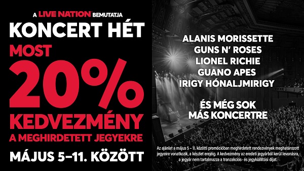 A hét folyamán 20% kedvezménnyel vásárolhatók meg a kijelölt jegyek olyan előadók koncertjeire, mint Alanis Morissette, a Guns N’ Roses, az Imagine Dragons, Lionel Richie, Sofi Tukker, Billy Idol, a Queens of The Stone Age, a Bilderbuch, Kat Von D, a Sextile, a Born Of Osiris, a The Streets, a Me First and the Gimme Gimmes, a Guano Apes, az Irigy Hónaljmirigy 35. jubileumi koncertje vagy éppen a Night Of The Jumps freestyle motocross esemény. Az akcióban résztvevő koncertek és a kijelölt jegyfajták részletesen a www.livenation.hu/koncerthet oldalon érhetők el.
