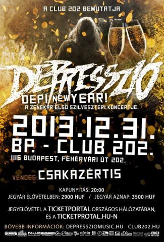 Korábban ígértünk nektek egy év végi meglepetést, ami nem más, mint az első szilveszteri koncertünk. December 31-én a budapesti Club202-ben zúzzuk át magunkat 2014-be. Még sohasem volt szilveszteri koncertünk, és jó pár évig nem is tervezünk hasonlót, de idén mindenképpen szeretnénk veletek együtt zárni az évet, és nyitni az újat. Természetesen egyedi műsorral készülünk a koncertre. Ezt az összeállítást máshol nem láthatjátok majd, és nyilván technikai oldalról sem fogjuk elaprózni a dolgot. A koncert vendége a Csakazértis lesz, akik után pontosan 22:00-kor lépünk színpadra. A koncertek után hajnalig bulizhattok majd a kedvenc Rock és Metal dalaitokra. Aki a pezsgősüvegekénél jelentősen nagyobb durranásra vágyik az év utolsó napján, annak mindenképpen ott a helye! Hamarosan bővebb információkat, és a koncerthez kapcsolódó extrákat osztunk meg veletek. Addig is, hálásan köszönjük, ha csatlakoztok a rendezvény hivatalos Facebook-eseményéhez, ha megosztjátok, és / vagy meghívjátok rá az ismerőseiteket!" - közölte a Depresszió zenekar.