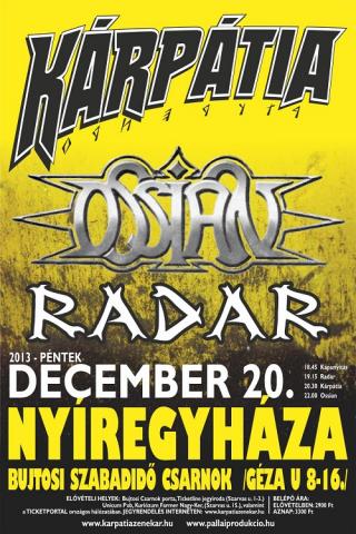 Nyíregyházát újra megszállja a rock szelleme a hétvégén. A mondhatni már hagyománynak számító nagyszabású koncertsorozat ezen a télen sem szakad meg! December 20-án, a Bujtosi Szabadidő Csarnokban 2013-ban a Radar, a Kárpátia és az Ossian döngeti a falakat.