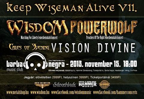 Keep Wiseman Alive – a hagyományoknak megfelelően most is ezen a néven, a Barba Negra Music Clubban tartja lemezbemutató koncertjét a Wisdom zenekar, november 15-én. A hazai power metal egyik legismertebb képviselője - a tavalyi alkalomhoz hasonlóan - most is a műfaj nemzetközi sztárjait látja vendégül: a zalaegerszegi Tales Of Evening mellett ugyanis a német Powerwolf és az olasz Vision Divine is játszik ezen az estén.