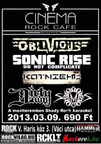 Ritka, mégsem lehetetlen, mikor egy buli folyamán folyamatosan a humor és a húzós metalriffek elegyét kapják a vendégek. Márpedig megvalósulhat, március 9-én, szombaton a belvárosi szórakozóhelyen 4hazai és egy osztrák csapat áll össze a terv kivitelezése érdekében. A résztvevők: Vegetáriánus többszólamú grindcore, avagy részeg galambok hemperegnek a mocsárban, mondá a Kotniehl. Paraszt agresszió, arcontalpaló riffek és fogós dallamok jellemzik a Sonic Rise produkcióját. A power punk/dirty R’n’R rémálom új márkaneve a Dirty Dawn. A durva zenei világtól függetlenül emberi mivoltát megőrző, szociálisan is érzékeny Samas. Valamint a sógoroktól érkezik a speedrock/anusrock stílusmegnevezésű Oblivious, első nagylemezének bemutatására szánva az estét. Feszes tempó, gyors dallamok korbácsolja fel az egyébként sem laposnak ígérkező hangulatot!
