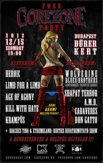 Ismét hallat magáról a hazai underground és extrém metal mozgalom első számú információs csatornájának számító GOREZONE rádióműsor (Tilos Rádió, FM 90.3, Budapest) stábja, amely amellett, hogy heti rendszerességgel ad hírt a színtér aktualitásairól, időről időre megtartja a műsor repertoárjába illő műfajok hazai képviselőinek seregszemléjét is a fővárosban, méghozzá ingyenes koncert keretében. A GOREZONE Partynak ismét a Dürer-Kert ad majd otthont 2012. december 15-én (szombat), 19:00 órától. A show szokás szerint óramű-pontossággal megy majd.