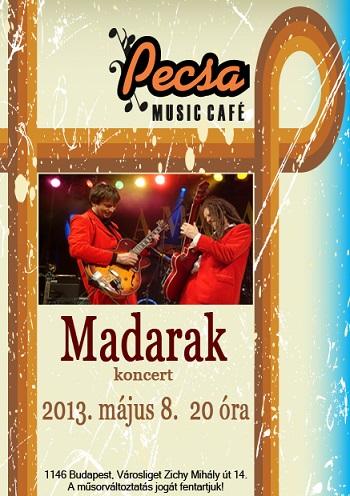 2013. május 6. - 2o13. május 8-tól, minden szerdán este 20 órától madárinvázió özönli el a Pecsa Music Café-t, de félelemre semmi ok, csak a Madarak együttes költözik a házba, hogy óriási hangulatot teremtsen. A rajongókat időkapszula utazás várja: fantasztikus slágerekkel az ötvenes évektől napjainkig, lesz zene, tánc, móka, kacagás, mulatozás, azaz igazi házibuli a hét közepén!