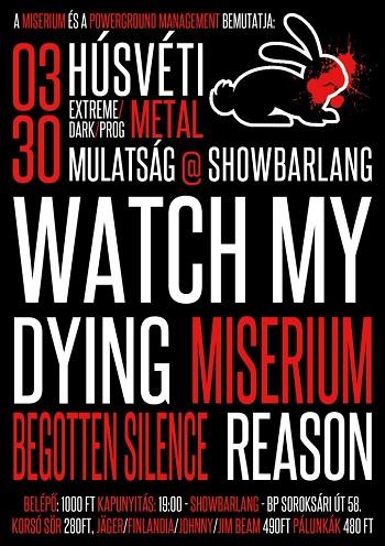 Ünnepeld velünk máshogy a húsvétot március 30-án a Showbarlangban! Idén a nyuszi helyett a ShowBarlang-ba 4 zenekar hozza az ajándékot, egy hatalmas metal bulit: a negyedik nagylemezére készülő Watch My Dying, a debütáló nagylemeze megjelenését váró Miserium, a Reason és a Begotten Silence.